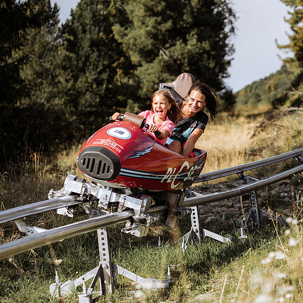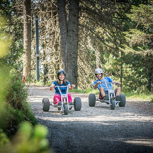 Über 9 km geht es auf den Mountaincarts Plose dem Tal entgegen. Die Strecke startet an der Bergstation der Kabinenbahn Plose und führt über Stock und Stein und durch magische Wälder hindurch. Schon Kinder ab 3 Jahren dürfen auf dem Schoß mitfahren.