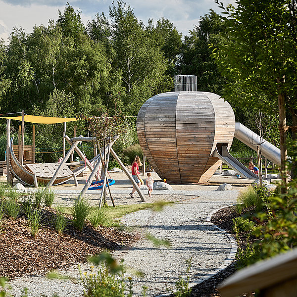 Auf dem Spielplatz in Raas dreht sich alles um den Apfel. Neben Schaukeln, Wipptieren, Trampolin, Wasserspiel- und Matschbereich, wartet als Highlight ein Spielturm in Apfelform. Eltern entspannen auf den Bänken und Holzdecks im Schatten der Apfelbäume.